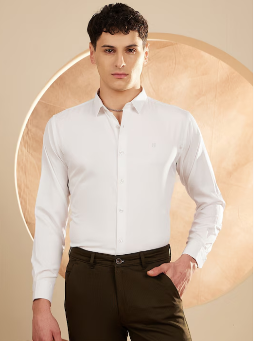 White solid opaque casual shirt ,has a spread collar, button placket, long regular sleeves, curved hem