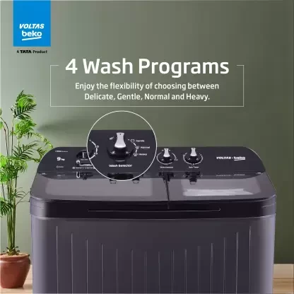 Voltas Beko by A Tata Product 9 kg washing machine with Soft Closing door, Water proof IPX4 protection, Special Pulsator and Double Waterfall Semi Automatic Top Load Black, Grey (WTT90UDX/BKGR4KGTD)