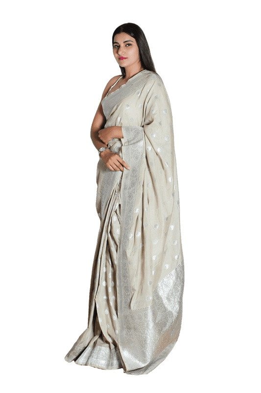 HAMH Pure Khaddi Georgette Bandhani Banaras Saree in Cream Color