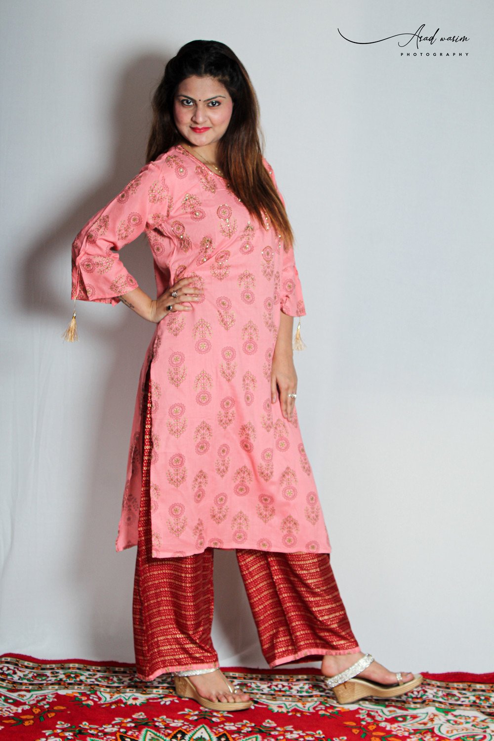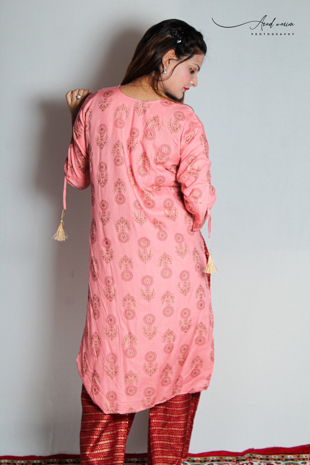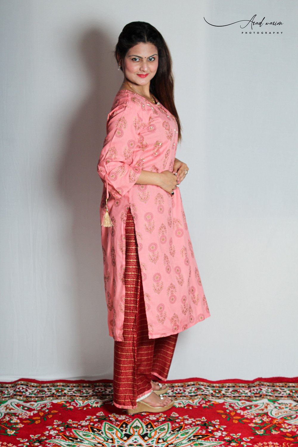 HAMH Womens Kurti Plazo Set Block Print Rayon Fabric in Light Pink Gajri Color