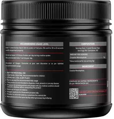 MuscleBlaze Creatine Monohydrate is India’s Labdoor USA certified Creatine for purity & accuracy. This implies certification for meeting international norms of heavy metals & microbiology tests and accurate Creatine quantity claim in the product. This Creatine Monohydrate from MuscleBlaze contains 3 g of fast-absorbing micronized creatine in each serving for a rapid absorption rate with faster results in building strength and endurance. It is an ideal source of 100% pure unadulterated, pharmaceutical-grade creatine monohydrate. It replenishes your energy levels that enhances your body's capacity to perform high-intensity workouts, lift heavier and improve physical performance. It also stimulates protein synthesis to help you attain lean muscle mass. An ideal pre-workout supplement to improve your strength and power. It is available in an unflavoured format. Caution: If you are suffering from pre-existing medical conditions, please consult your doctor/physician before use.