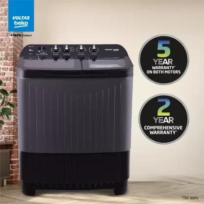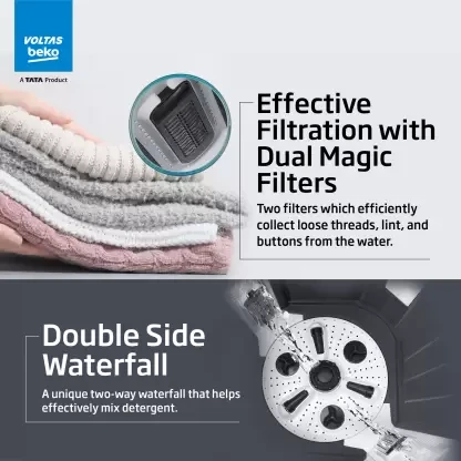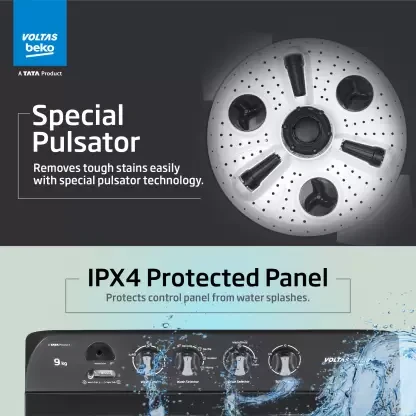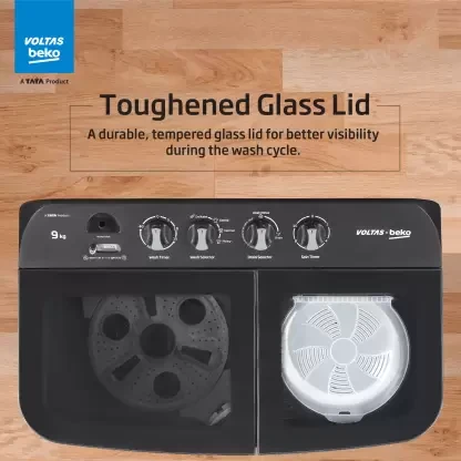 Voltas Beko by A Tata Product 9 kg washing machine with Soft Closing door, Water proof IPX4 protection, Special Pulsator and Double Waterfall Semi Automatic Top Load Black, Grey (WTT90UDX/BKGR4KGTD)